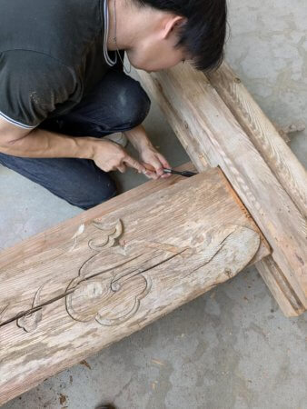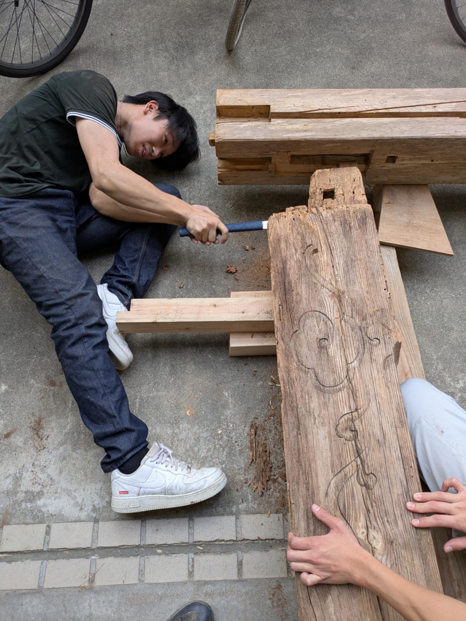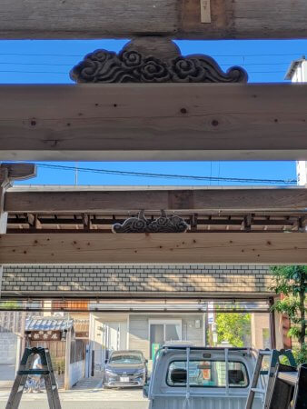 仁王門の古材の木鼻、大斗、肘木、そして蟇股(かえるまた)が乗りました。