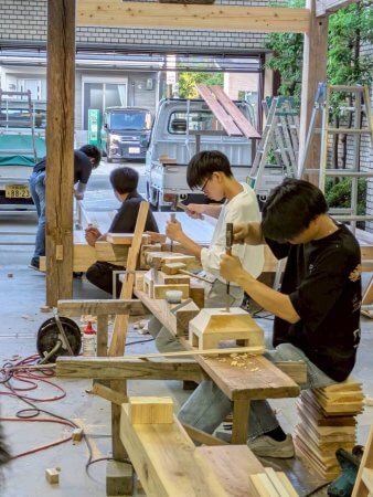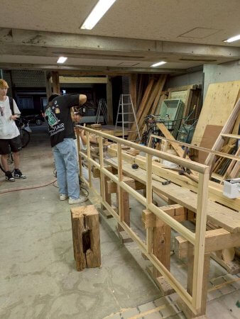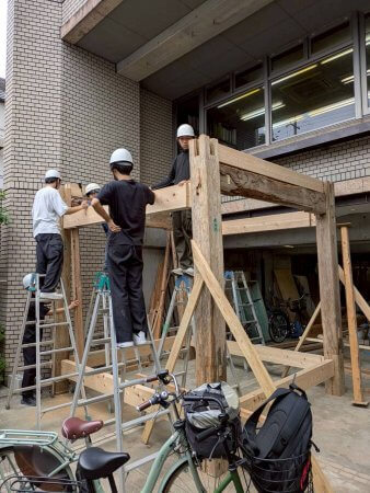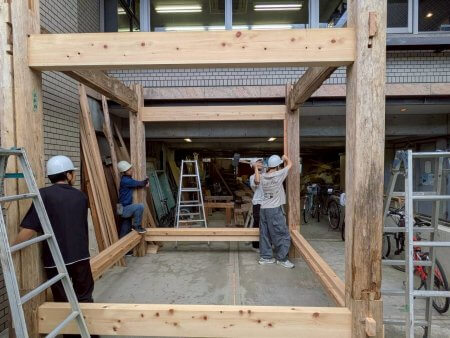 万博イベントの前日となりました。放課後、みんなで正面と天井の和紙を貼り、確認の上、解体を始めます。