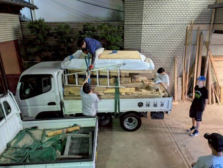 運搬を頼んだ卒業生君のトラックに積み込みます。晩に終了、解散。明日は5時過ぎに集合、出発します。寝坊しないでね。(9/30)