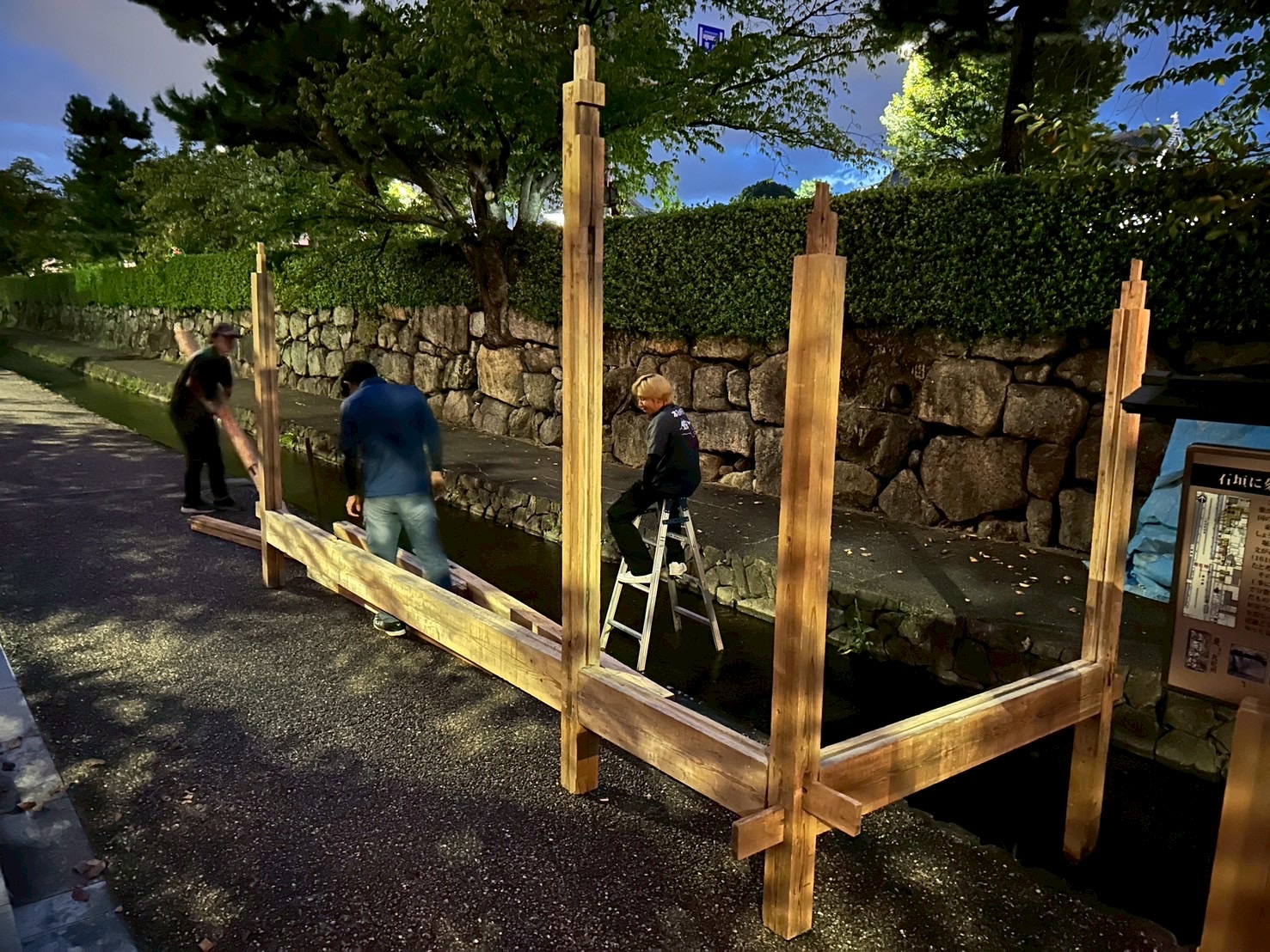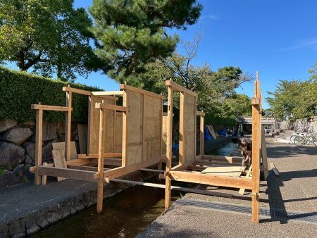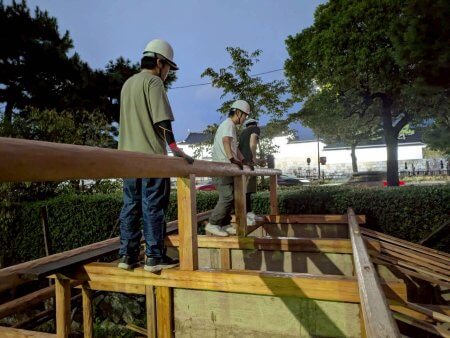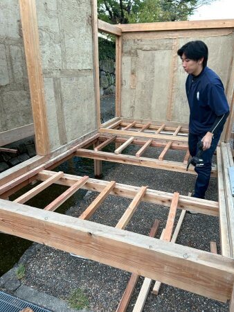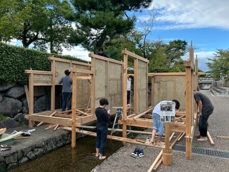 17代目堀川茶室2025 建築日誌 建て方・棟木編 9月20日〜 2025/10/7 堀川茶室, 京都建築ブログ 万博茶室の作業が終わってから、堀川茶室の作業をするという流れで、堀川茶室の建て方は始まりました。 時間を作っては壁を作り、ちょっとずつ進めていきます。今年は早い段階で、一年生も一緒に作業してくれているので助かります! 根太は、曽我くんが位置を決めて、岡山くんがサクッとビス留めしていってくれました。万博茶室や他の改修をしているからか、作業のスピードが上がってます!速い! 日曜の藁葺き作業をするために、急ぎ棟木を込みます。 (Harumi.I)