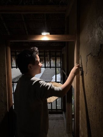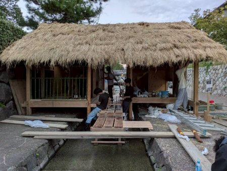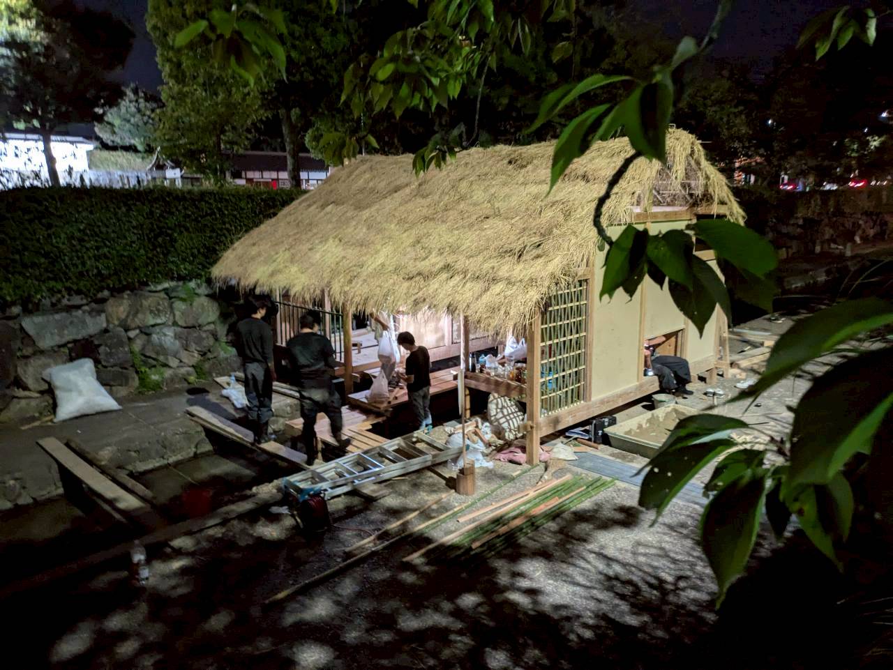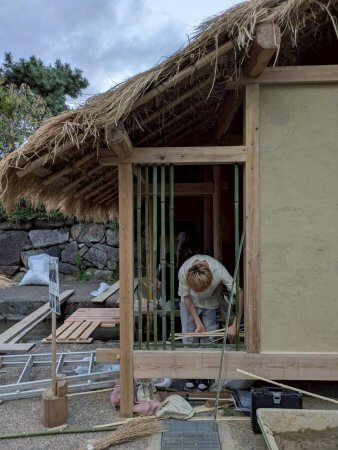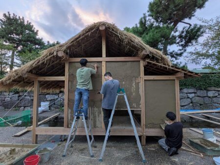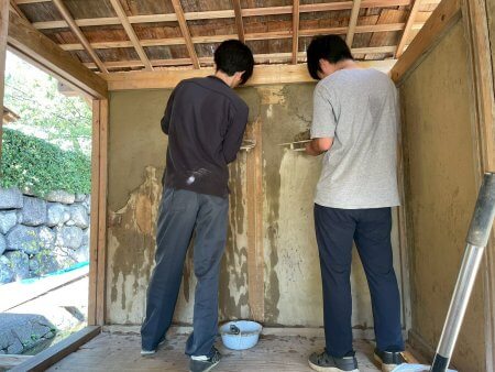 2025年の堀川茶室もいよいよ大詰め。放課後、学生くんたちが土壁を塗り出しました。