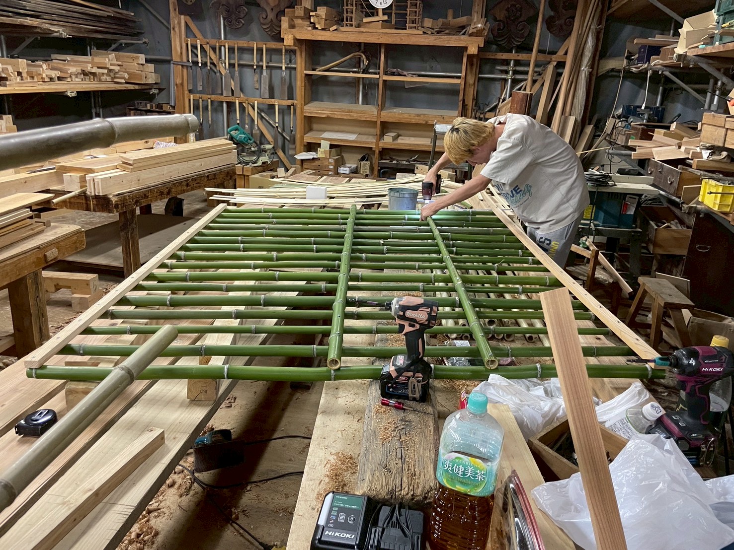 なんと真竹の太いのをもらってきて割って小舞をこしらえています。そんなことで間に合うの?