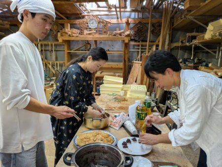 卒業生たちがぼちぼちやってきます。彼らは7、8年前に卒業しましたが、毎年来てくれます。いつしかベイビーも出来ていますよ。堀川茶室version3を完成させてくれました。
