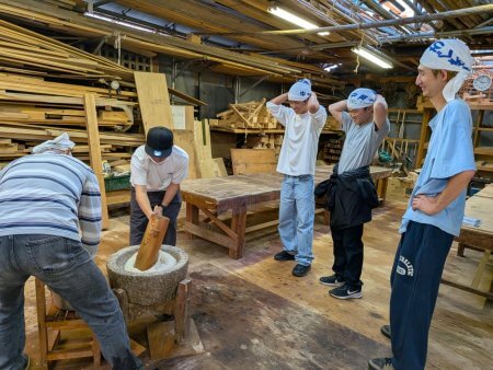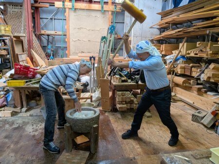 2001年からの建工祭から始めたお餅つき。ふだんご迷惑をおかけしているご近所さんに搗き立てのお餅を配ろうという趣旨でしたが、25年続いています。