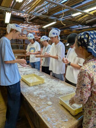一臼目がつけたので、みんなで丸めます。まずは白餅。