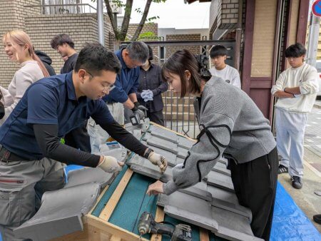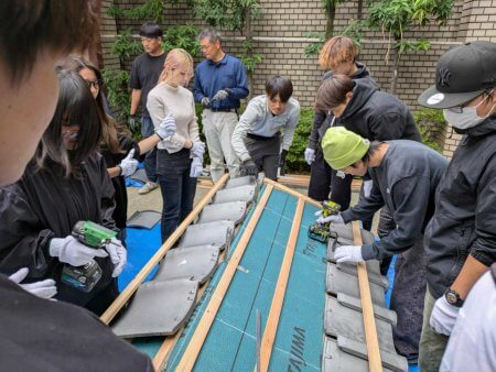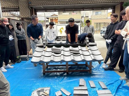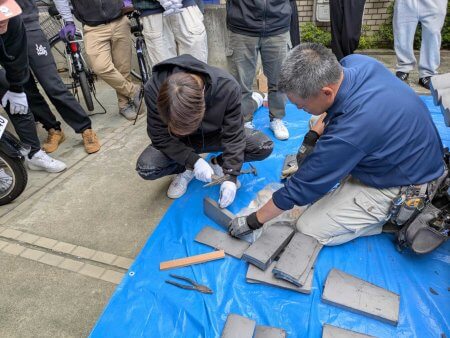毎年恒例の京都瓦屋根工事組合青年部による瓦葺き体験セミナー。最近まで暑かったのがここにきて急に寒くなって、ガレージでのセミナーはまさに吹きっさらしの中での作業となりました。もっとも、数年前には雪が降る中でやったこともあるので、それよりはずっとましですが。