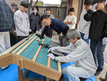 熨斗のピッチを半枚ずらすために熨斗を半分に切断します。たがねを使って学生君もチャレンジ。うまく行きました。拍手!