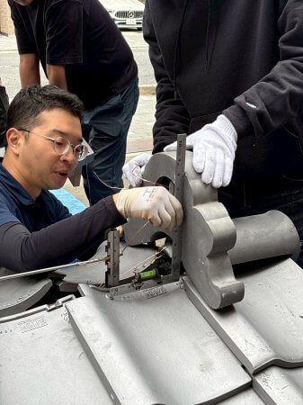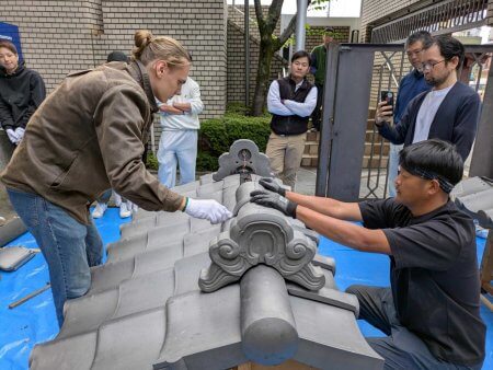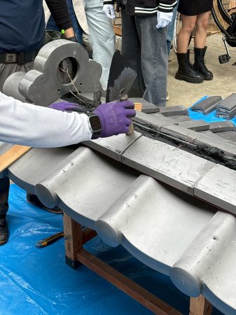 最後に冠瓦を伏せて、銅線で留めていきます。これで終了!
