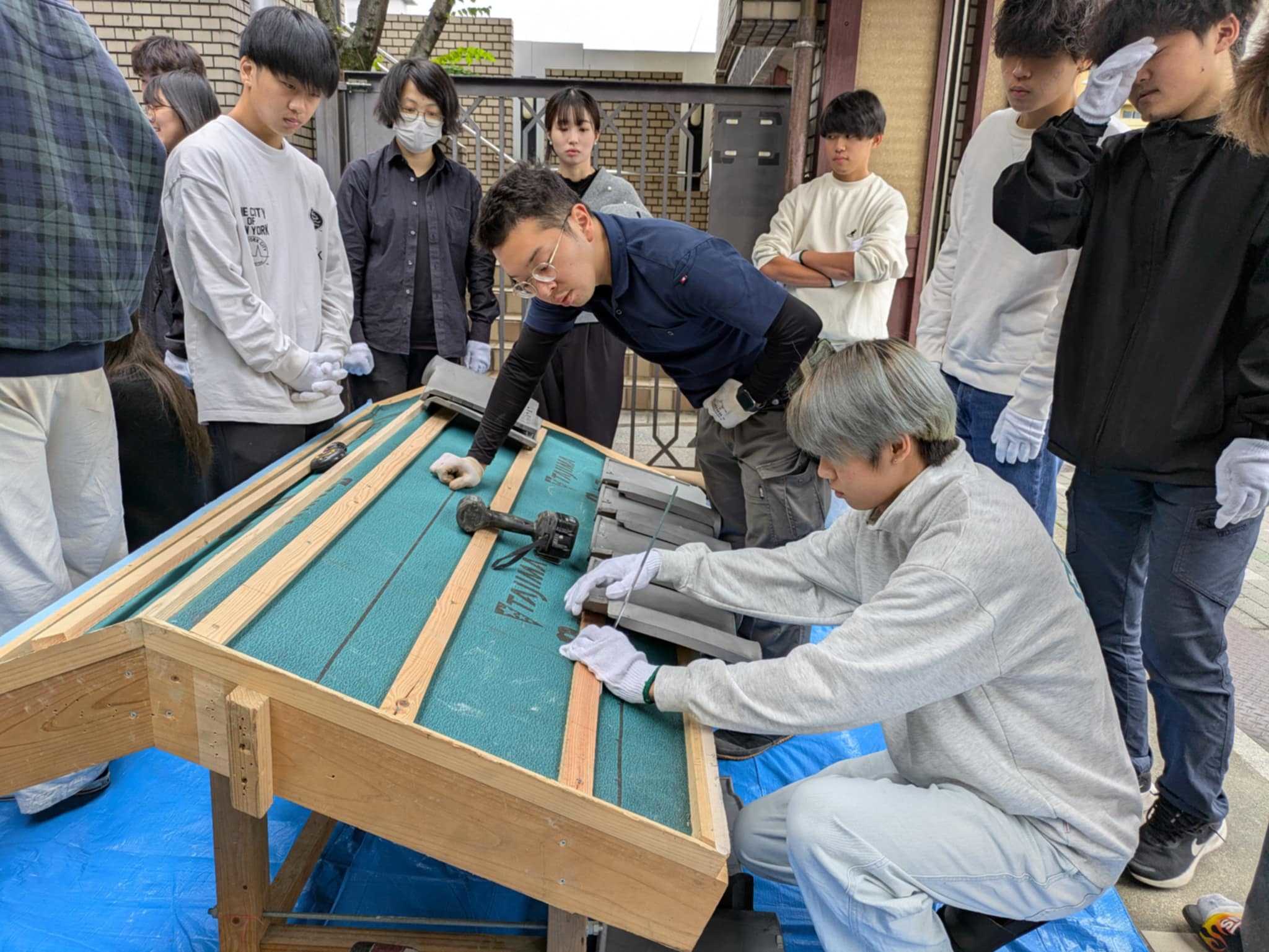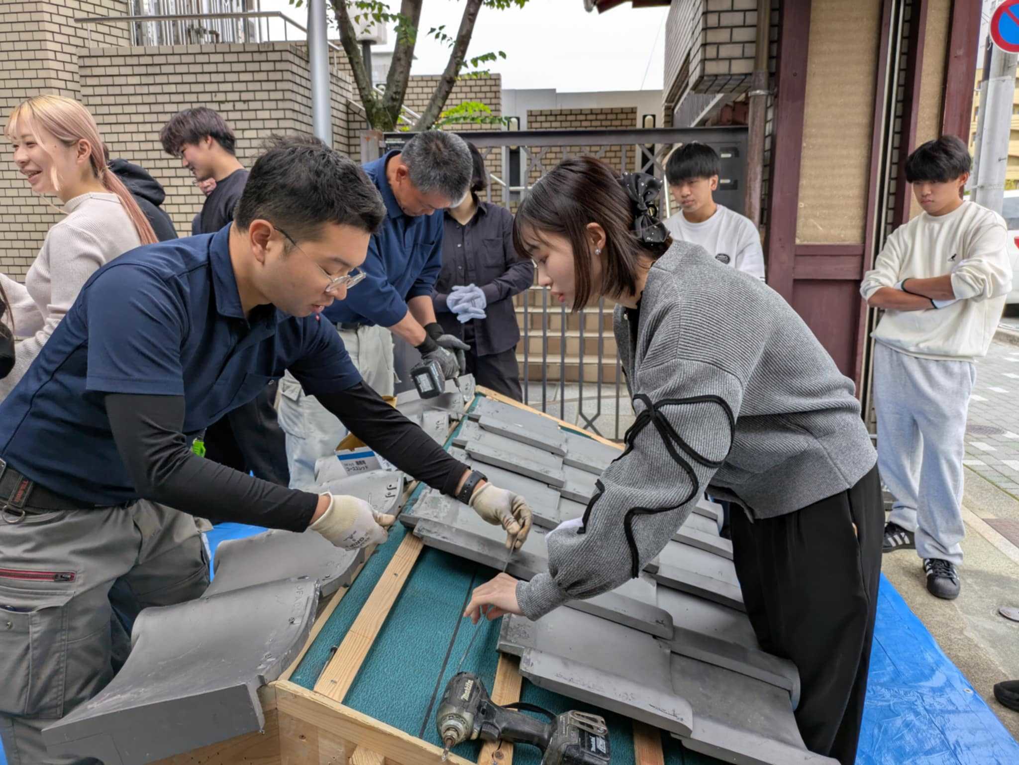 毎年恒例の京都瓦屋根工事組合青年部による瓦葺き体験セミナー。最近まで暑かったのがここにきて急に寒くなって、ガレージでのセミナーはまさに吹きっさらしの中での作業となりました。もっとも、数年前には雪が降る中でやったこともあるので、それよりはずっとましですが。