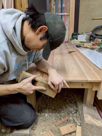Y田君は縁側の桁を刻み、F君は階段の土壁下地塗り。