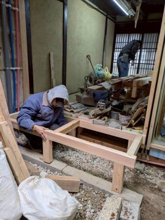 12月18日長屋改修現場実習の日。S田君の縁側の据付。さすが、寸分の狂いもなく、きれいにおさまった。拍手!もう一人のY田君も頑張ってね。