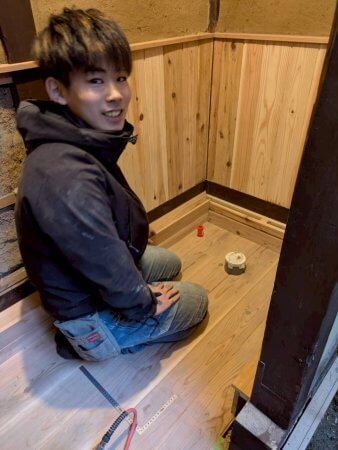 S我君がトイレの腰壁板を張る。先に上端の水切りを留めた方がいいよ。