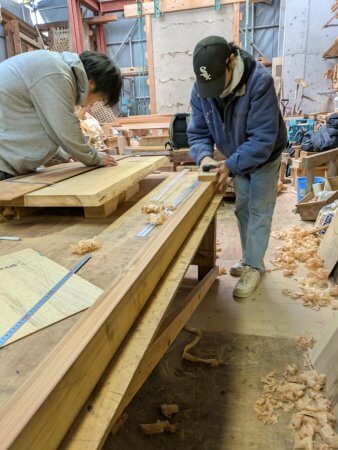 12月22日今年最後の実習の日。作業場では木工家具の製作。杉板を接ぎ合わせる加工はやはりS田君にやってもらうことに。長台を持っている学生ってどうなの。精度がまるで違うね。