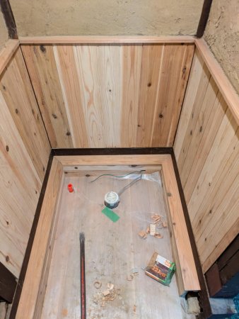 通り庭の配線棚とスイッチボックスをS我君に取り付けてもらう。黒塗りするつもりでフシだらけの材なのだが、白木のままでいいかも。