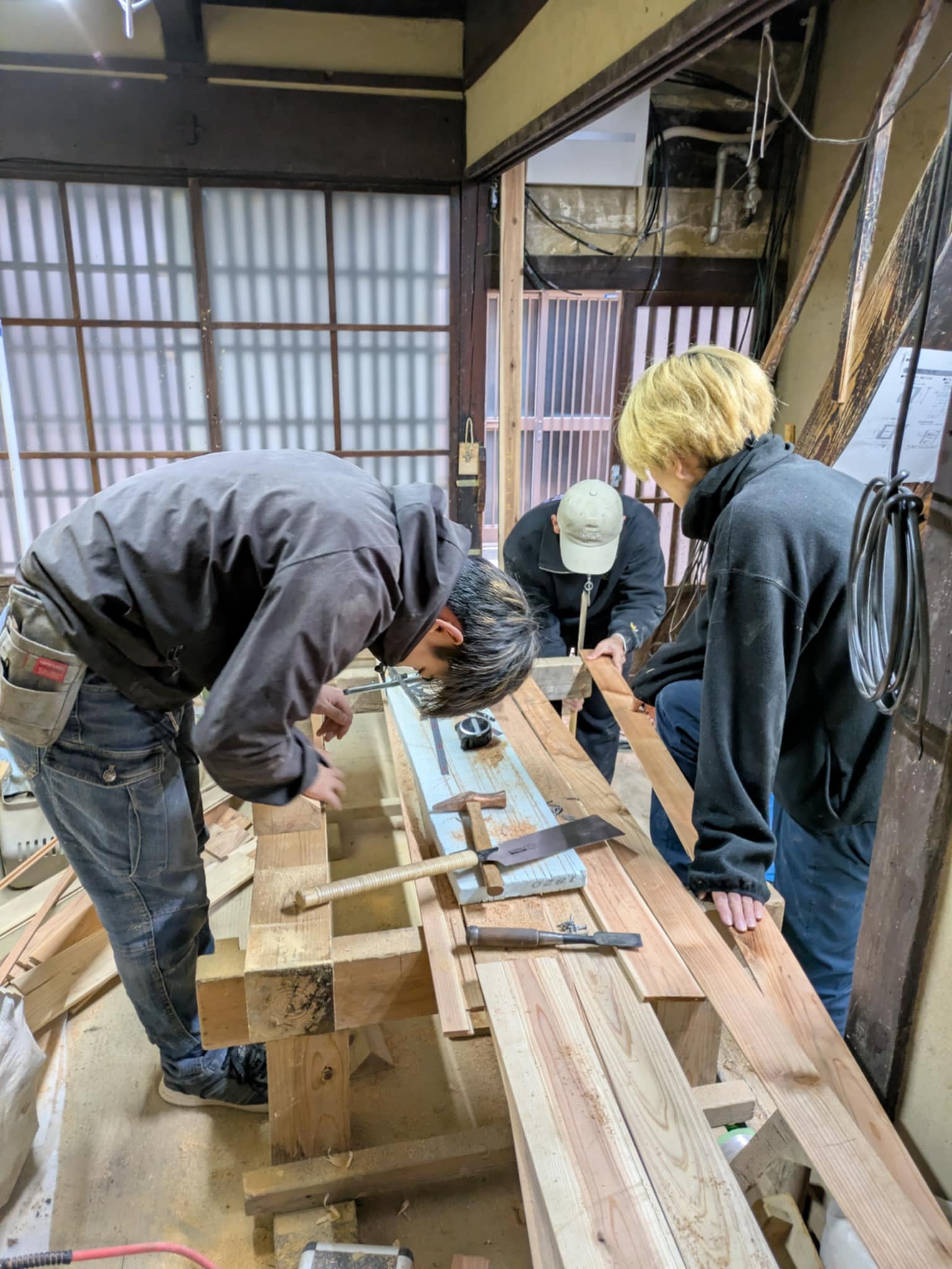 12月8日長屋改修実習の日。縁側の桁を加工する者、