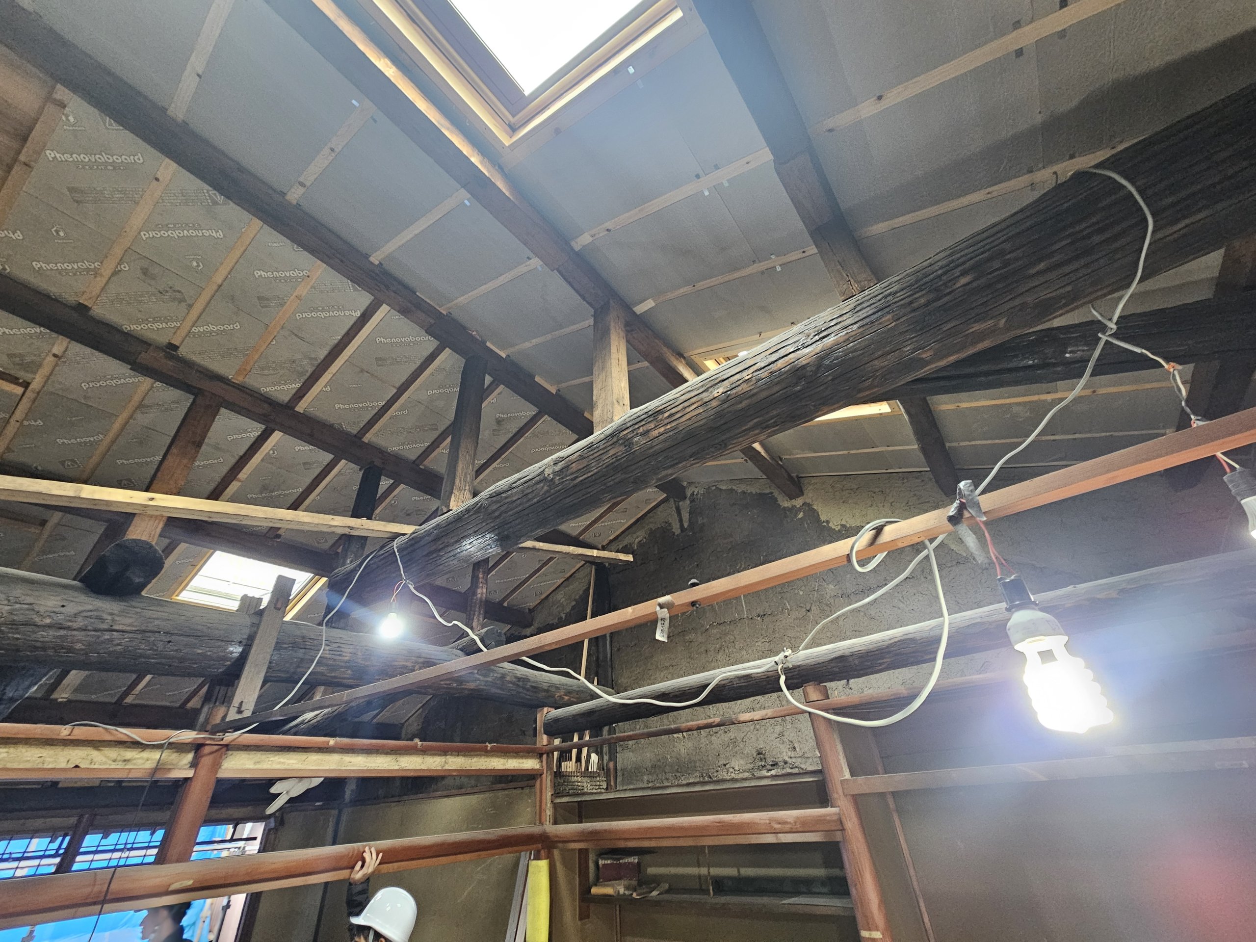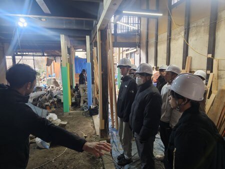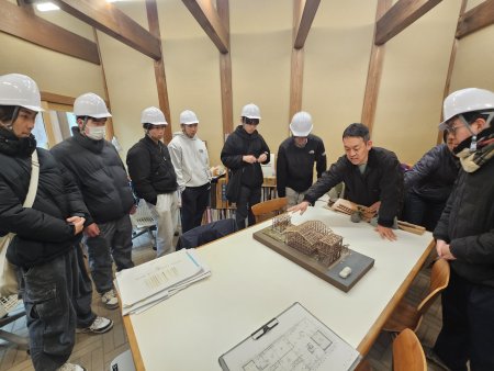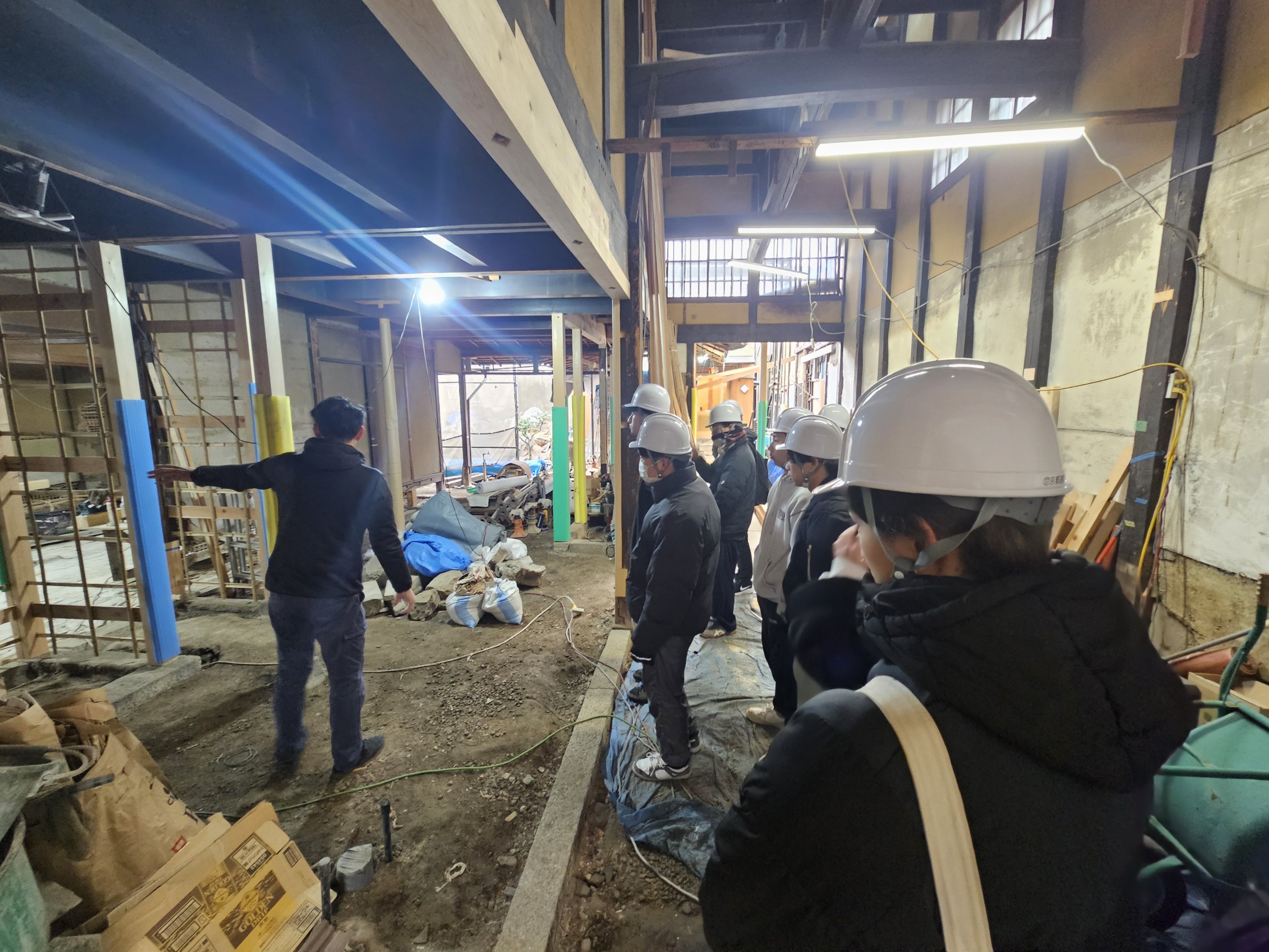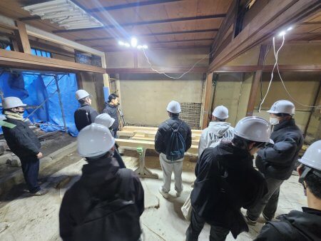 施工中の町家見学 1月20日 見学会, 学生, 京都建築ブログ, 授業風景 建築科2年の建築施工の授業で中京区にある施工中の町家の見学に行きました。 普段は座学の科目ですが、見学にも行きます。 工務店で働いている講師の先生のつながりで今回、見学させていただきました。施工中の現場の中を見学できる機会は貴重なため、実際に見て学べるこの機会は、学生にも好評です。 二階の現場です。 設計士の方から模型や施工図を見せていただき、説明を受けました。 学生みんな熱心に聞いて、質問をしていました!
