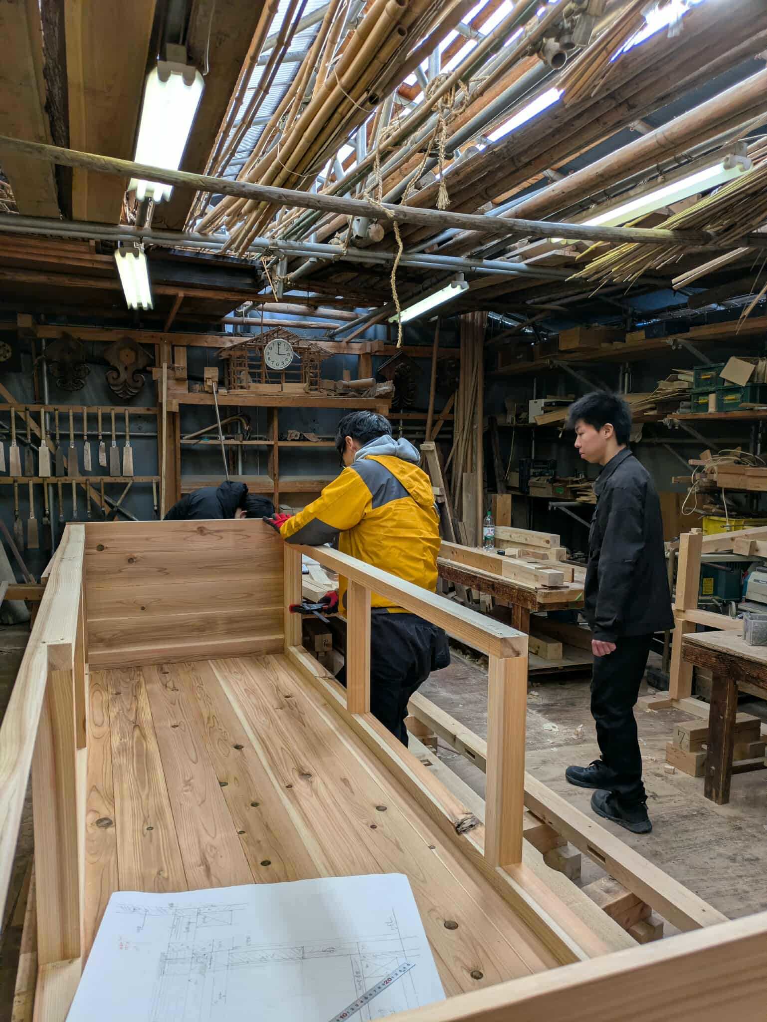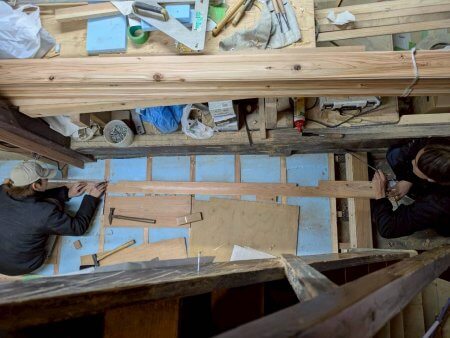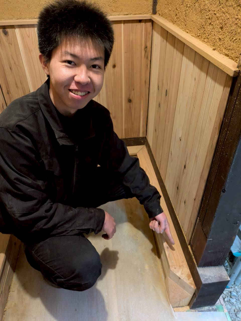 現場ではO山くん、F坂くんが通り庭の床板を張ってくれています。がんばれ!