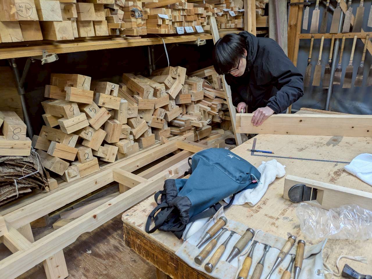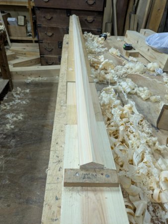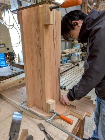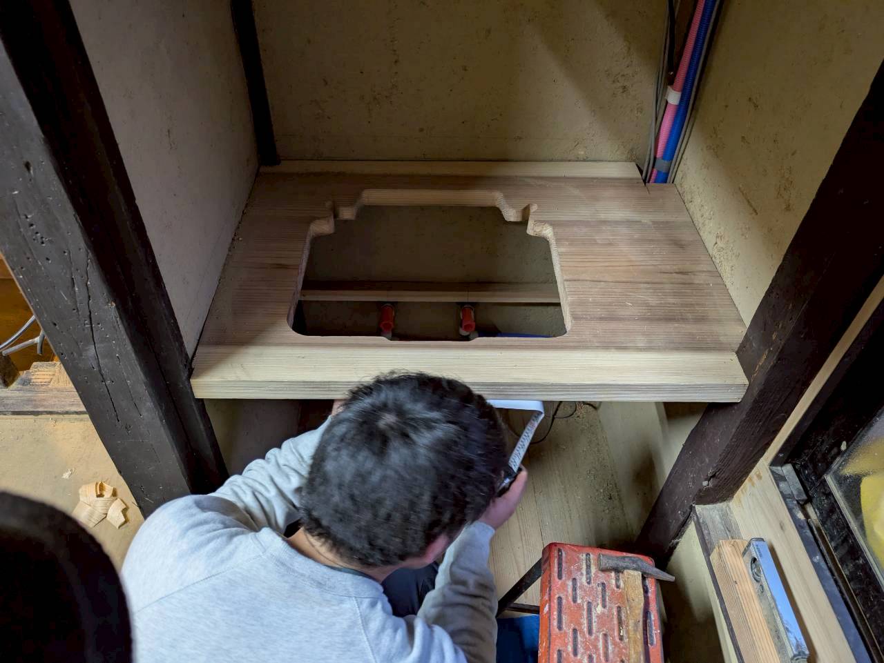 その蓋が出来て框(かまち)が収められました。ちょうどいい欅の材があったので、それをカンナ掛けしています。