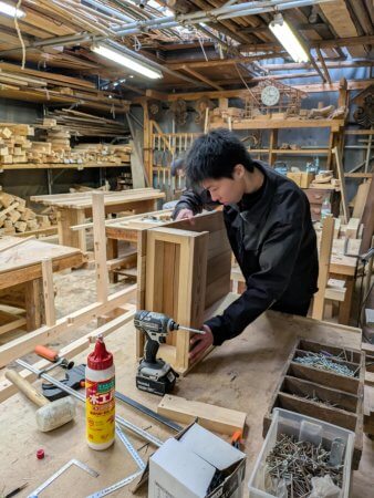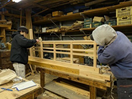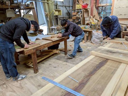 S田くんは掘り炬燵のテーブル、S永くんは洗面台、S賀くんは手洗い台を加工している。