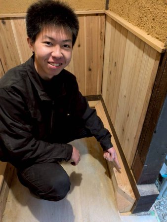 試験が終わって2月2日、作業再開。M上くんがトイレの巾木の角の納まりをやっています。やっと出来て満面の笑顔。