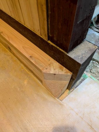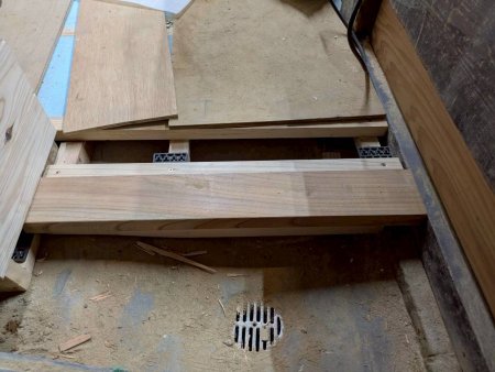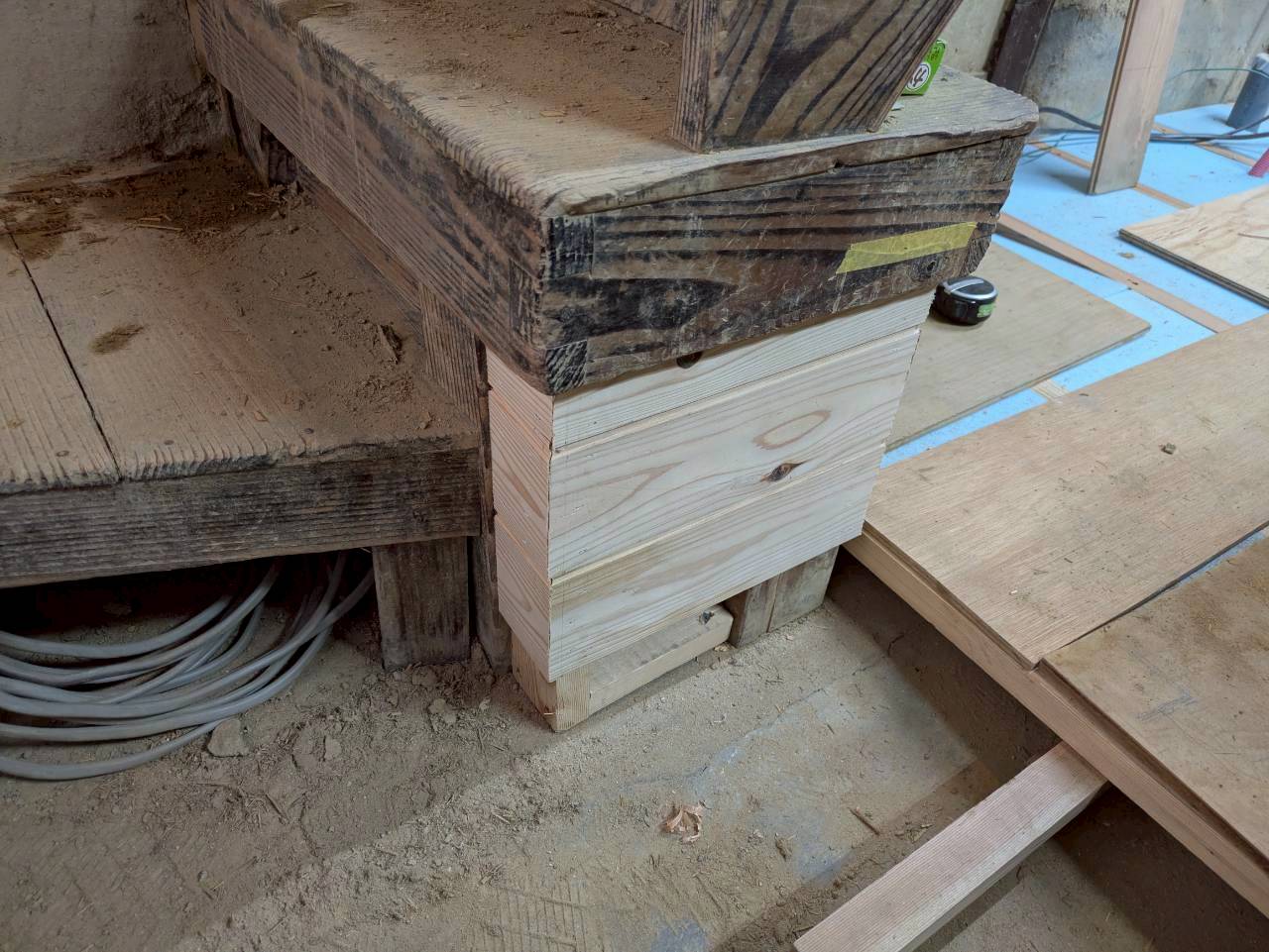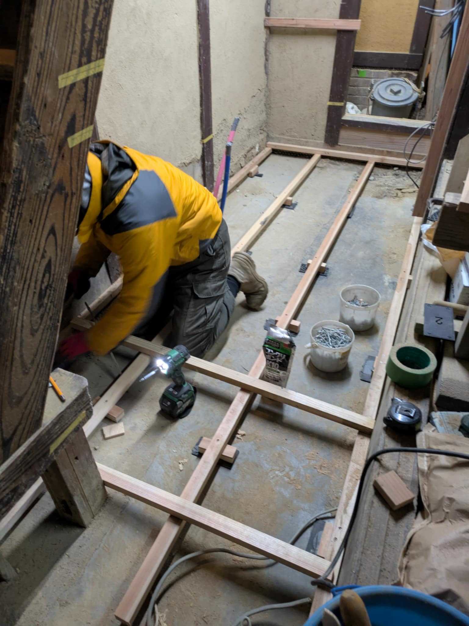 2月29日通り庭の根太+スタイロ断熱材を仕込み、入り口の階段下部分を蓋してます。なかなか苦労してやっと出来ました。