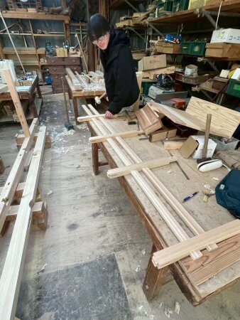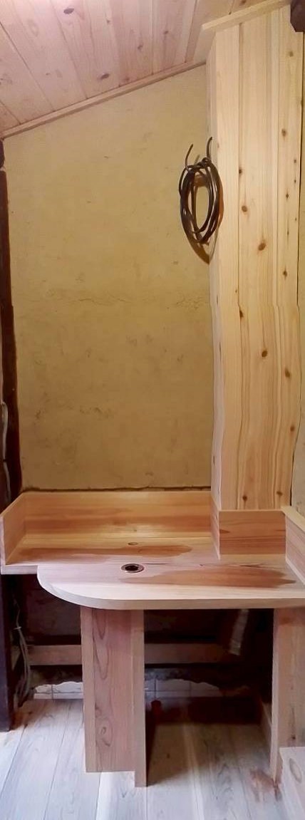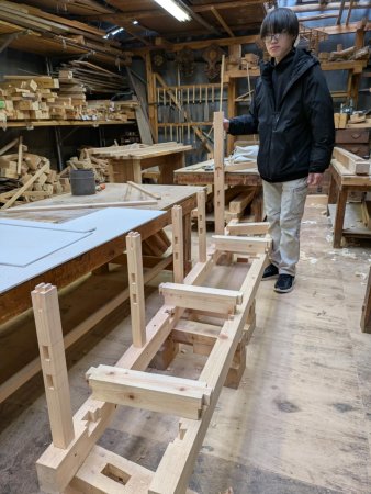 S賀くんの手洗い流し台の脚をやってもらっています。なかなか複雑な細工が必要なところです。もう少しだね。