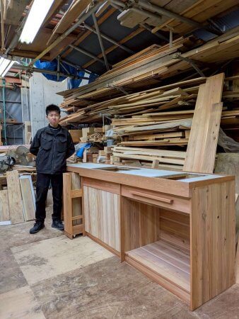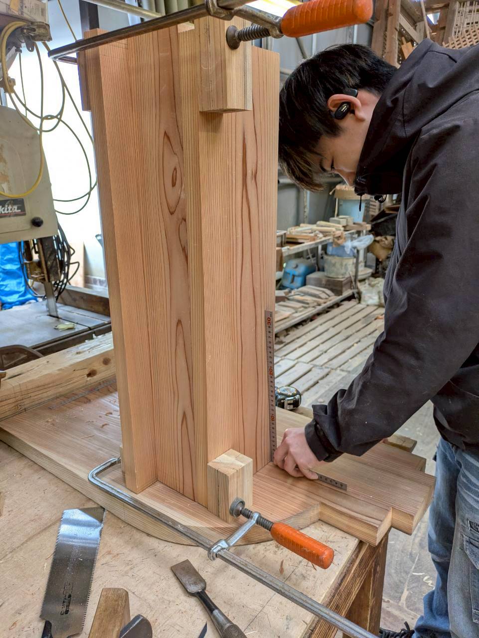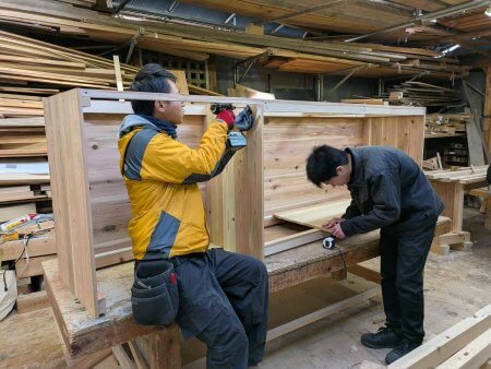 休日返上でM上くんに手伝ってもらってお施主さんと一緒にキッチンを組み立てます。上下のフレームに杉板パネルを付けて箱にしていきます。