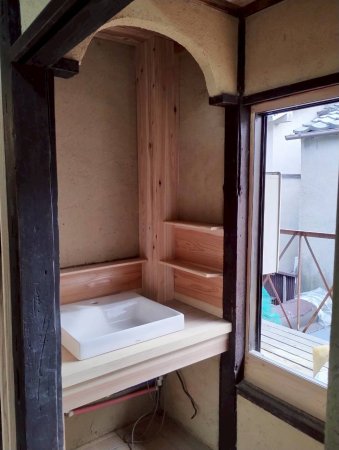 S永君の洗面流し台です。PSもできましたね。棚もつきました。
