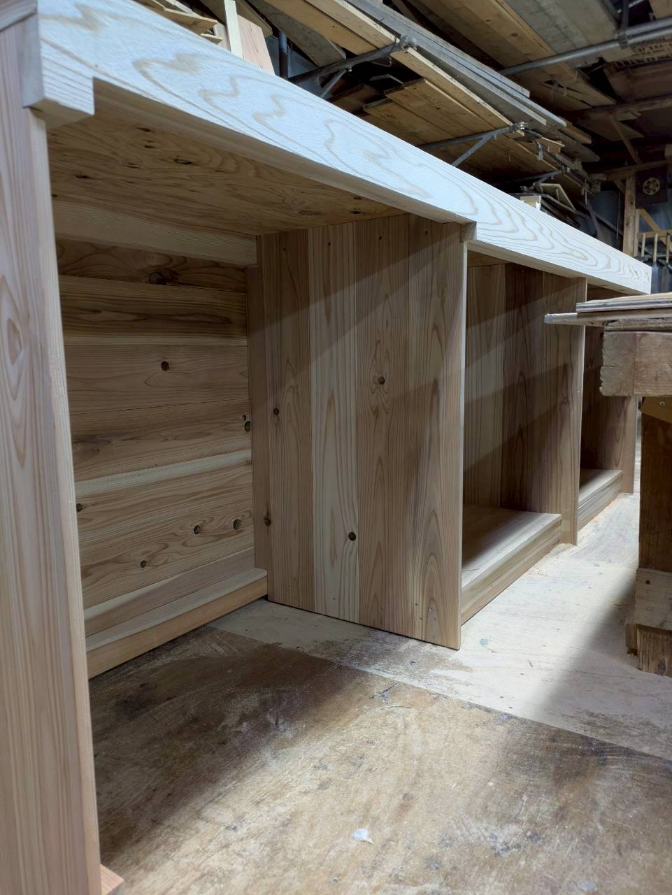 こんな感じに出来ました。後はこれにカウンターの加工をして、引き出しと扉をつけていきます。