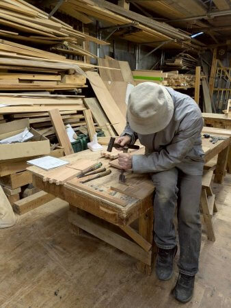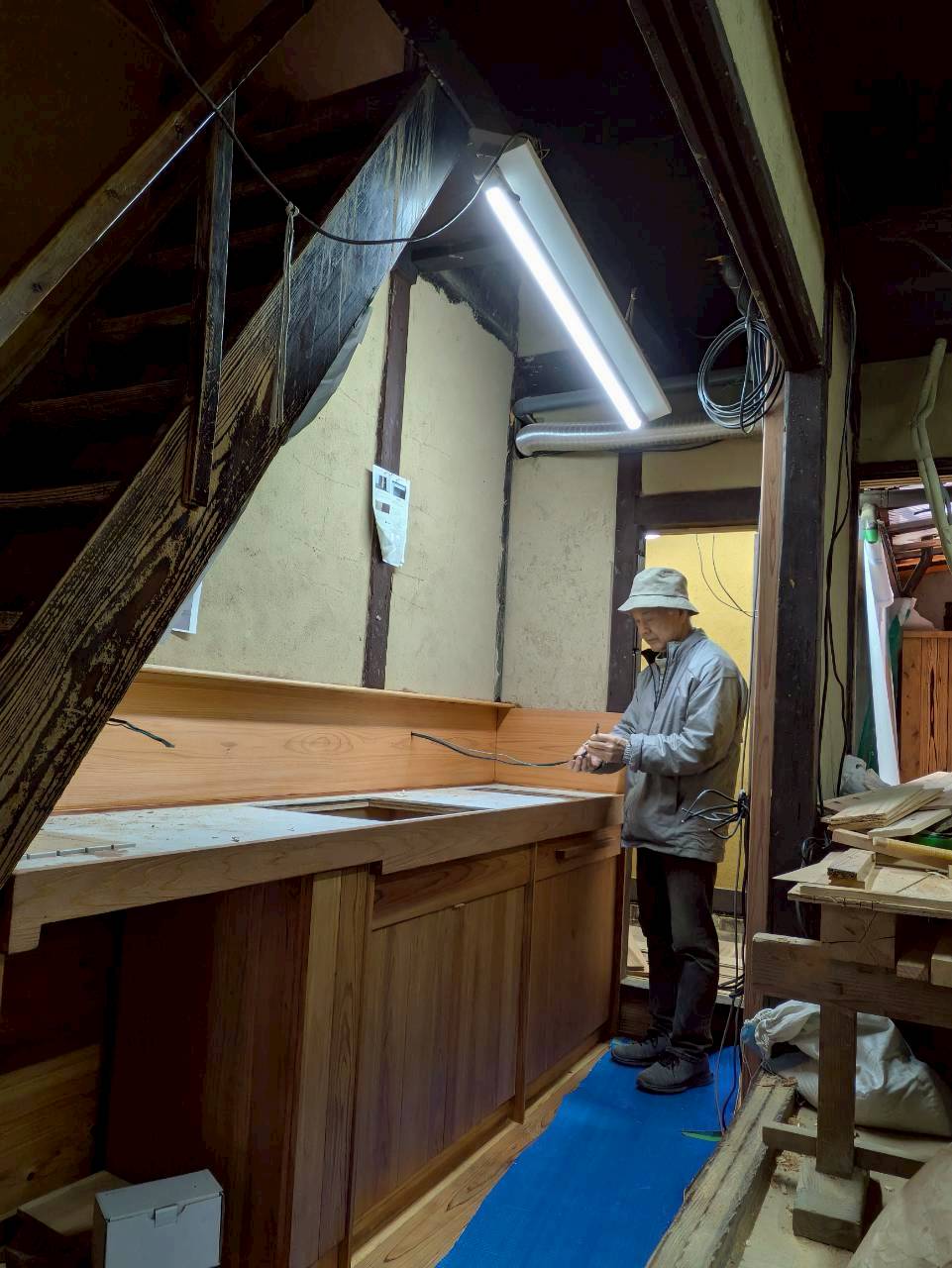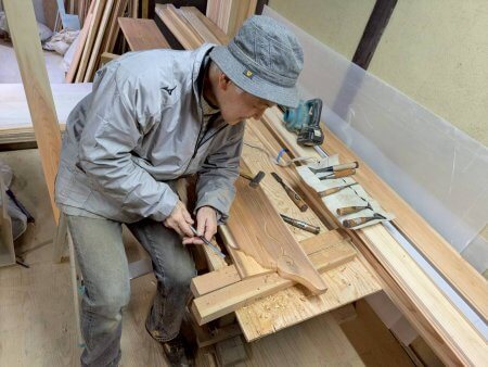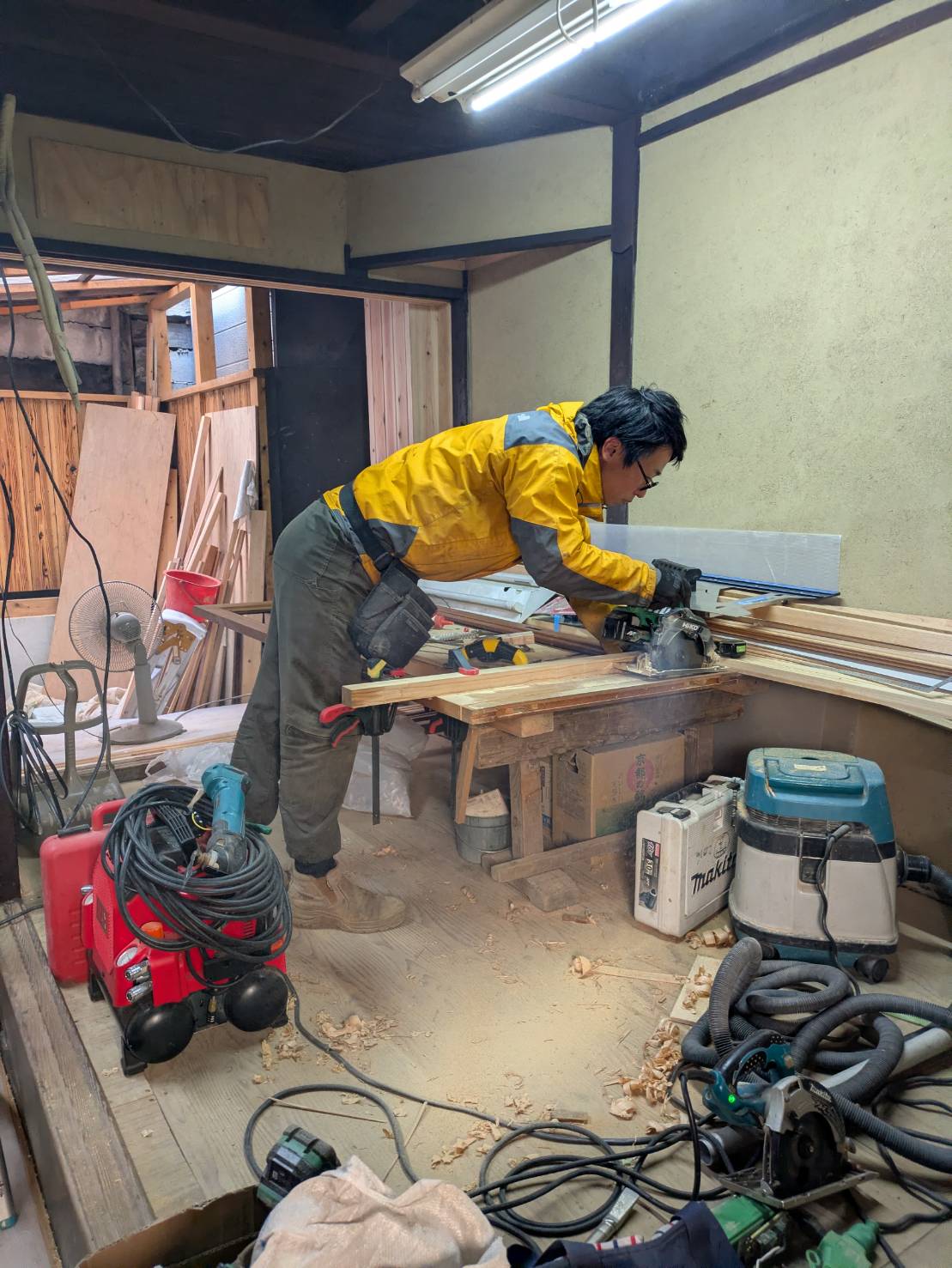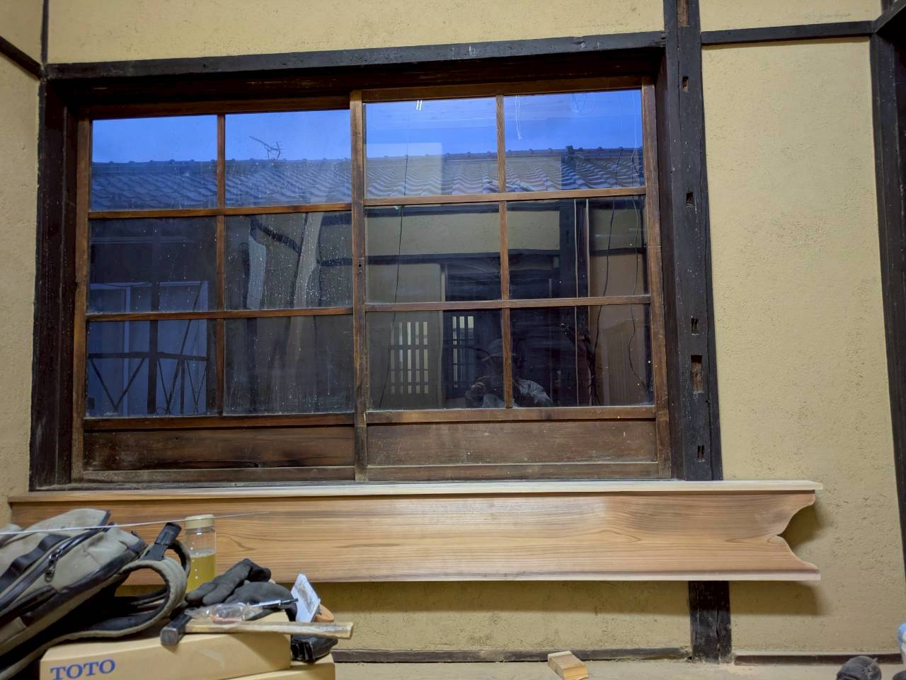 施主さんも来て持ってきたガラス框戸を調整しているところです。