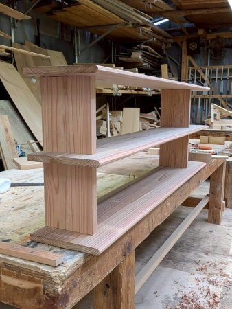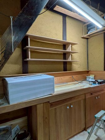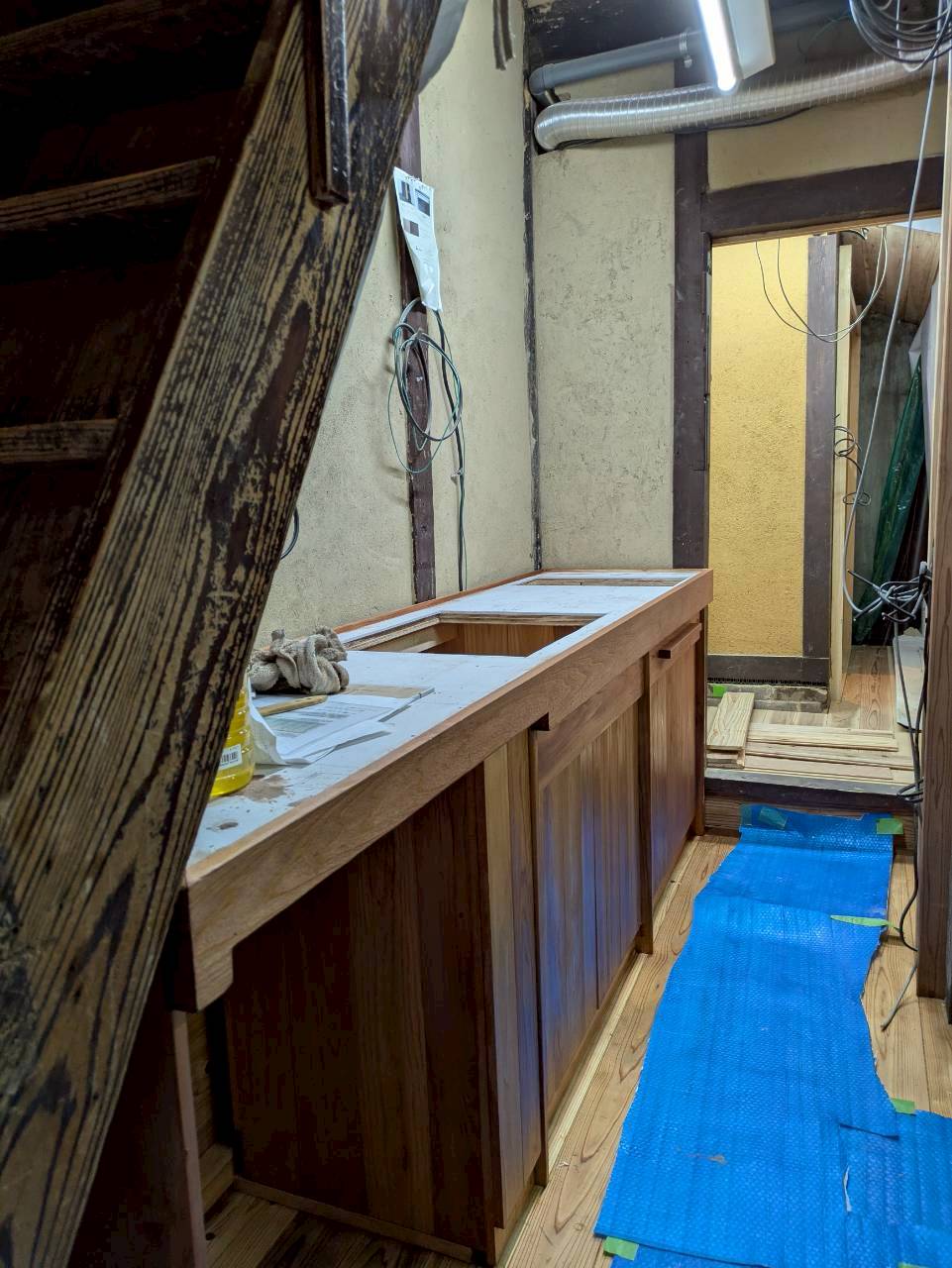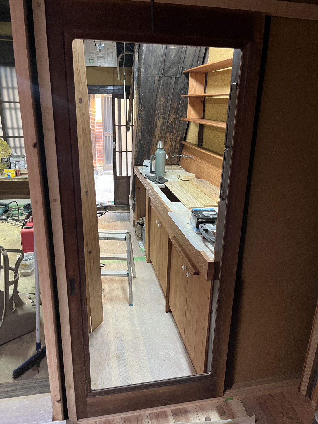 9日、キッチンの前板と棚を付けました。電線はここにコンセントを仕込むものです。