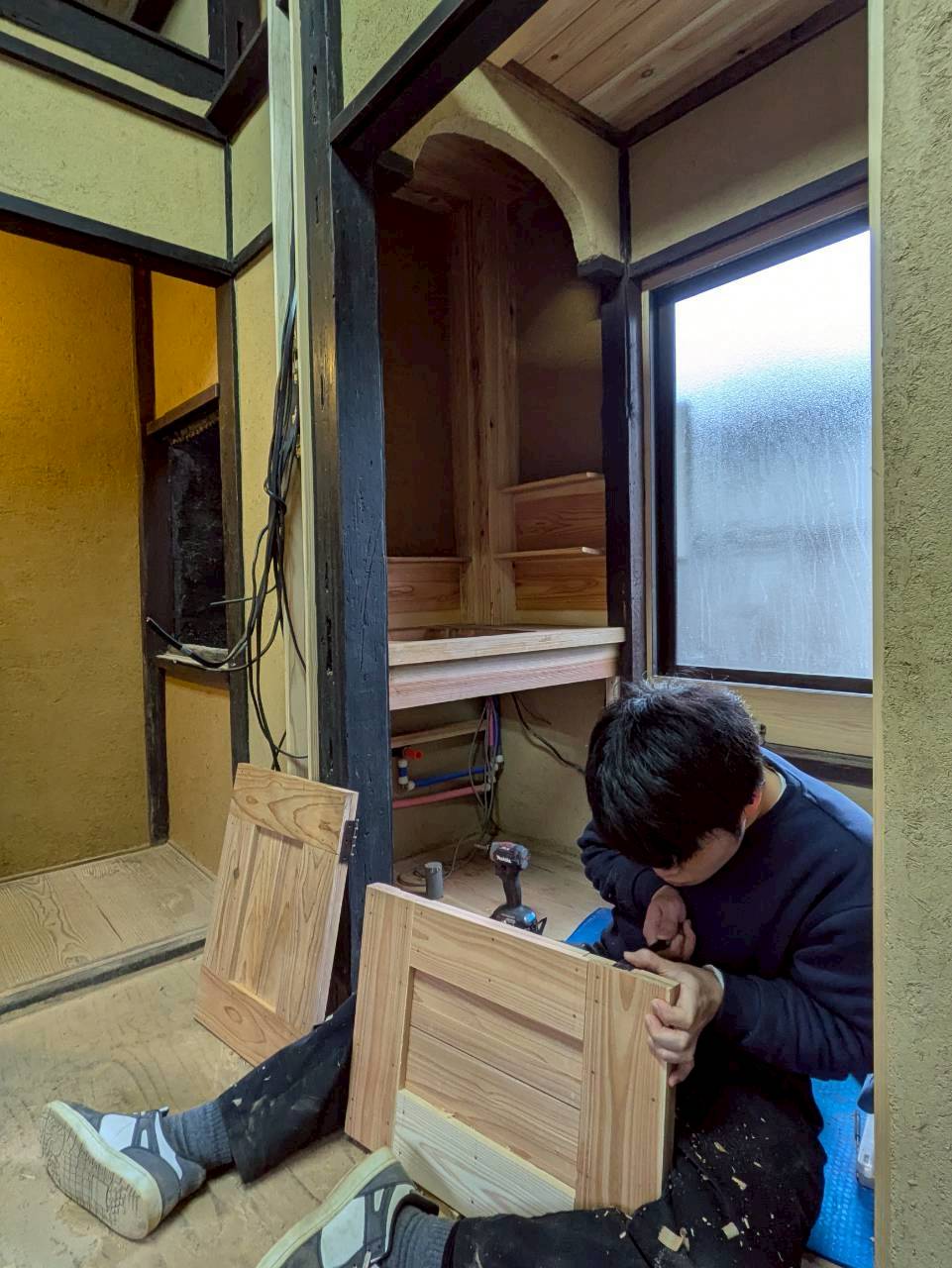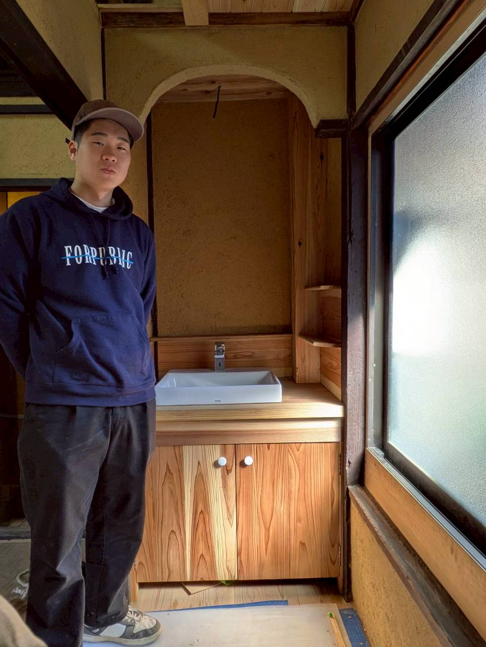 2階ではS永君が洗面台の扉に蝶番を仕込んでいます。
