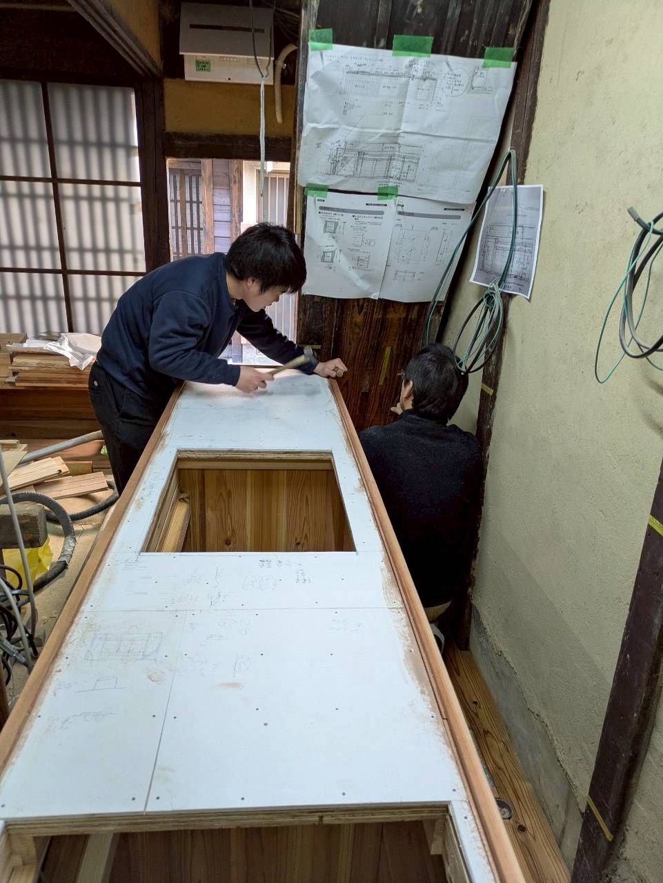 3月4日、キッチンユニットを現場に収めました。M上くんが手伝いに来てくれています。