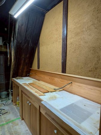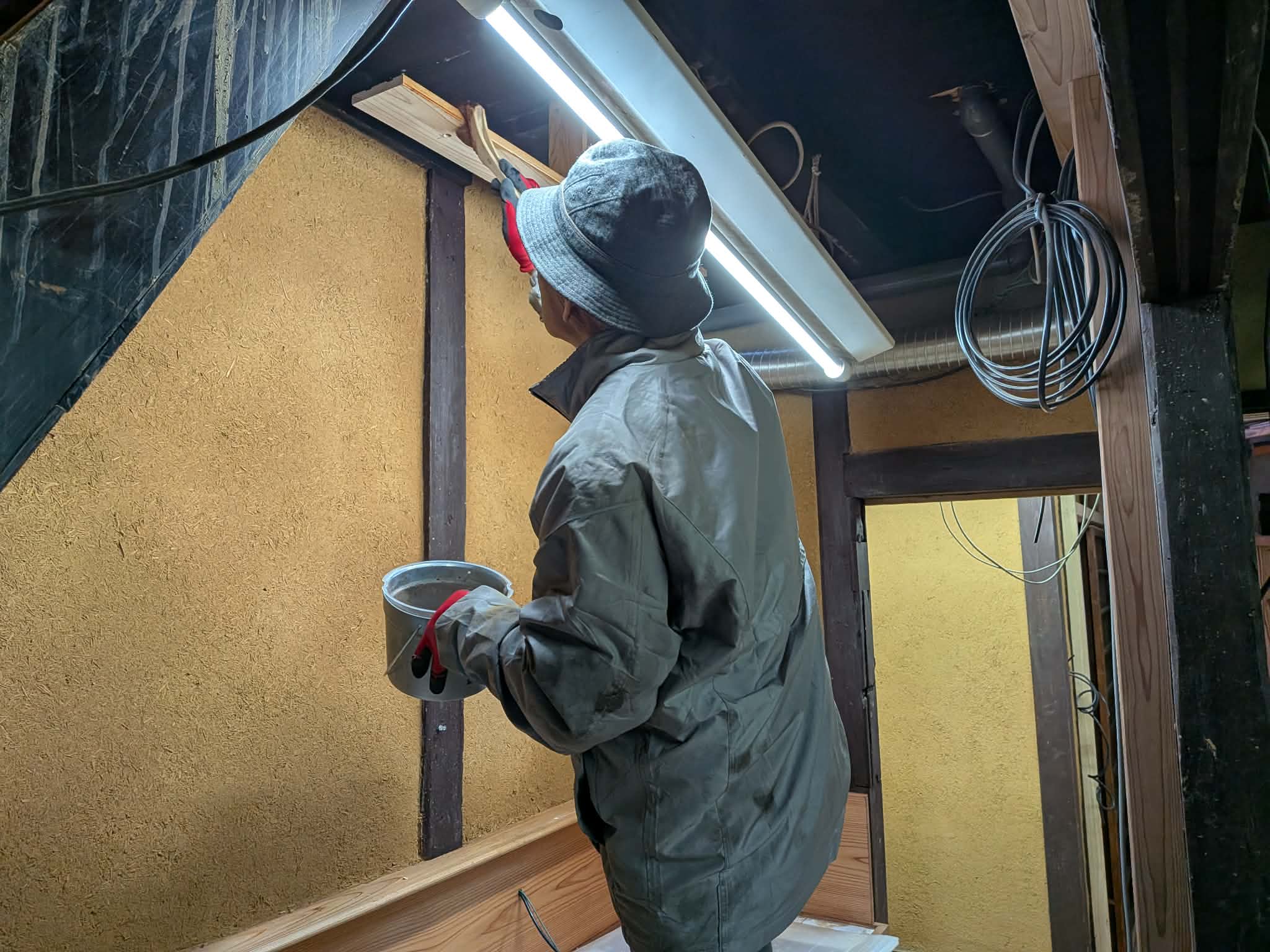 12日、前板に柿渋と油を塗って、土壁を塗りました。
