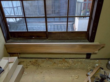 13日、2階の窓下に枕当たり板を拵えます。取り外しができるように、雇い蟻で留めます。