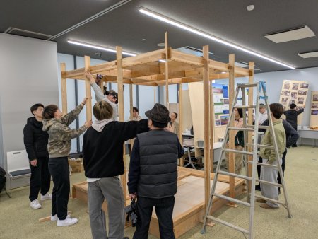 卒業制作展は昨年と同じ府立大学のところにある歴彩館にて2月21日〜24日に行われました。21日の午前中は会場設営、午後からオープン。長屋改修チームも写真パネル展示をしました。メンバーがお茶部でもあるので、例年のお茶室を制作にかかりきり。
