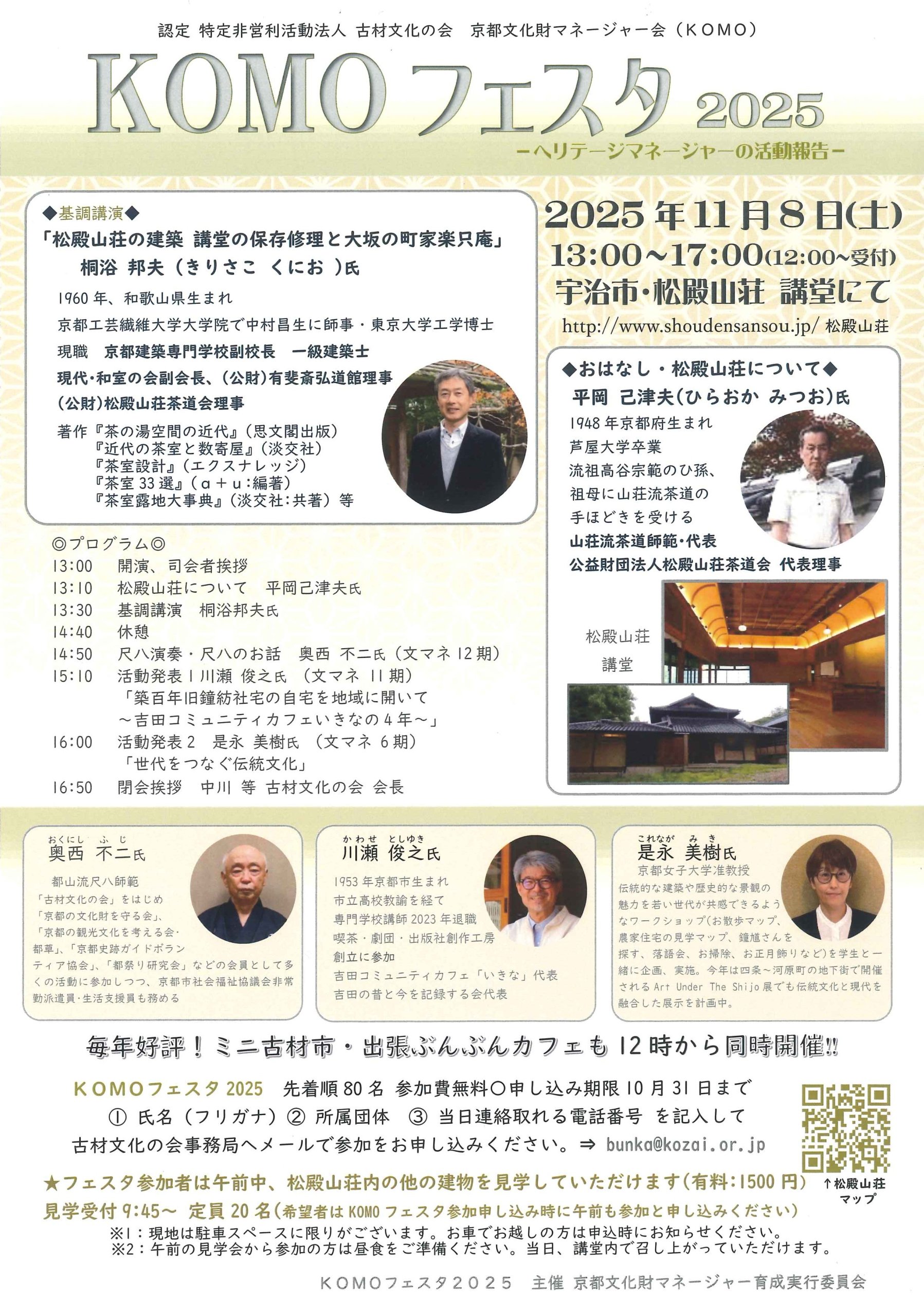 桐浴先生が「KOMOフェスタ2025」で基調講演されます! 2025/10/19 シンポジウム, 課外活動, 講演, 教員, イベント, お知らせ, 京都建築ブログ 桐浴先生が「KOMOフェスタ2025」(主催:京都文化財マネージャー育成実行委員会)で基調講演されます! 詳細については、特定非営利活動(NPO)法人 古材文化の会 TEL 075-632-9646 までお問い合わせください。